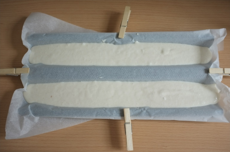 Préchauffer le four à 205°C et recouvrir un moule à 2 baguettes d’une feuille de papier cuisson. Pour maintenir la feuille de cuisson, pincer le avec des pinces à linges, le temps de déposer la pâte sans gluten, les bords légèrement relevés, car la pâte sans gluten est plutôt liquide.
