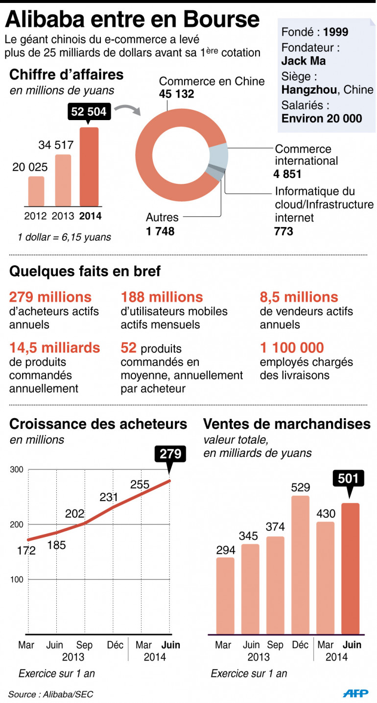 Ces chiffres font d'Alibaba, start-up fondée en 1999 par un professeur d'anglais avec 60.000 dollars, un bulldozer en Bourse pesant 168 milliards de dollars.