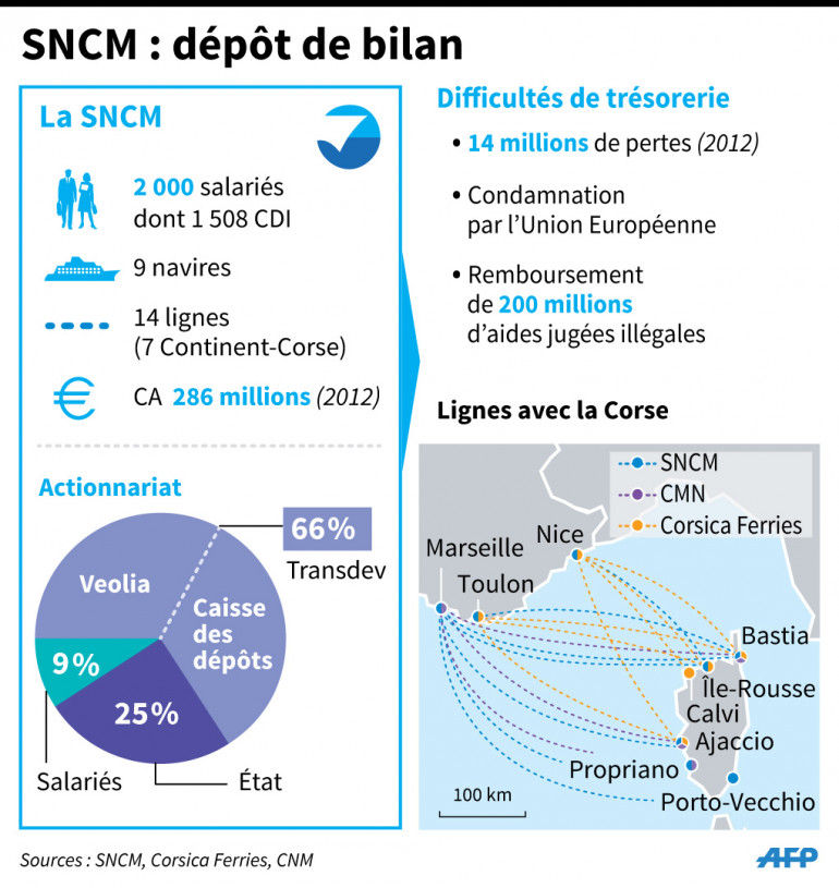 Les actionnaires majoritaires de la SNCM, Transdev, Veolia, et l'Etat, soutiennent depuis plusieurs mois la solution du dépôt le bilan, puis du redressement judiciaire, seule solution selon eux pour "empêcher (sa) disparition pure et simple".