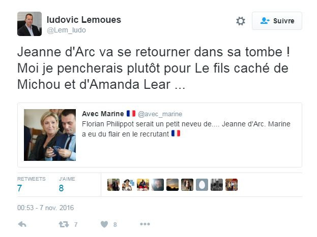 En révélant les liens familiaux (lointains) qui unissent Florian Philippot et Jeanne d'Arc dans son livre Le Dico des politiques, Jean-Louis Beaucarnot n'imaginait sans doute pas provoquer une telle réaction publique dans le camp des détracteurs du numéro deux du FN. Dans un tweet plus que douteux, Ludovic Lemoues, responsable pour le parti de la cinquième circonscription des Français de l'étranger (Monaco, Portugal, Espagne, Andorre) et plus de 2.900 abonnés au compteur, a livré un commentaire étonnant en réaction à l'information : "Jeanne d'Arc va se retourner dans sa tombe ! Moi je pencherais plutôt pour le fils caché de Michou et d'Amanda Lear...", écrit-il, très probablement en référence à l'homosexualité assumée du numéro deux du parti.