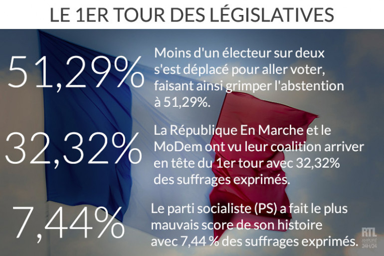 La politique française change de visage après ce premier tour des législatives. Les candidats du parti d’Emmanuel Macron arrivent largement en tête à l’issue du scrutin du dimanche 11 juin avec 32,2% des suffrages. Un bémol à ce raz-de-marée annoncé : le taux d'abstention n'a jamais été aussi haut sous la Ve République. Il s'élève à 51,29%, environ un électeur sur deux ayant boudé les urnes. Ce sont d'abord les 57% d'électeurs de Marine Le Pen qui ont choisi de ne pas aller voter. 53 % de l'électorat de Jean-Luc Mélenchon n'a pas souhaité se prononcer non plus. Même les partisans d'Emmanuel Macron n'ont pas tous voté pour lui. 38% d'entre eux se sont abstenus. Jamais un président nouvellement élu n'avait représenté si peu d'électeurs. Seul un inscrit sur six a voté pour La République En Marche.