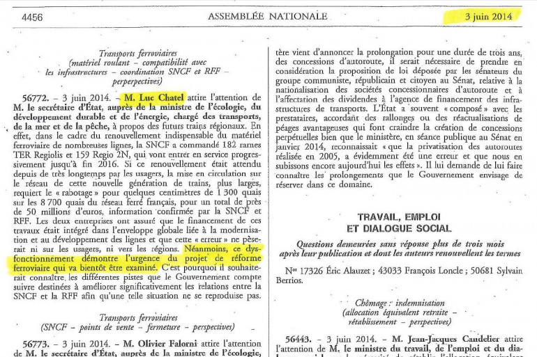 "Le gouvernement doit retirer le texte", affirmait ainsi Luc Chatel le 16 juin dernier. Pourtant, à peine 13 jours plus tôt, il la réclamait "d'urgence". Lors des questions au gouvernement du 3 juin, Luc Chatel, alors seulement député UMP, attirait l'attention de "monsieur le secrétaire d'État, auprès de la ministre de l'Écologie" sur "l'urgence du projet de réforme ferroviaire qui va bientôt être examiné".