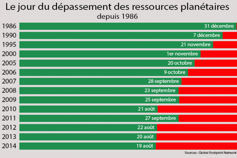 D'année en année, la date du jour de dépassement des ressources recule. Le 19 août 2014, la planète a épuisé ses ressources naturelles pour l'année et va devoir vivre en "déficit écologique" jusqu'au 31 décembre, selon un rapport alarmant de l'organisation Global Footprint Network, publié ce mardi.