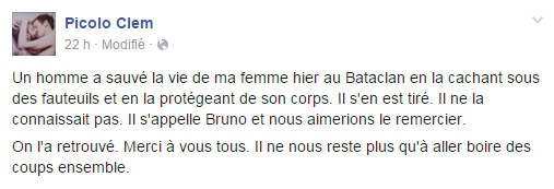 Dimanche 15 novembre, un internaute a également posté sur Facebook un message adressé à un certain Bruno. "Un homme a sauvé la vie de ma femme hier au Bataclan en la cachant sous des fauteuils et en la protégeant de son corps. Il s'en est tiré. Il ne la connaissait pas. Il s'appelle Bruno et nous aimerions le remercier. Qu’il nous contacte, moi ou Edith. Faites tourner et partagez, on ne sait jamais", a-t-il écrit. L'homme a finalement été retrouvé grâce au message sur le réseau social.