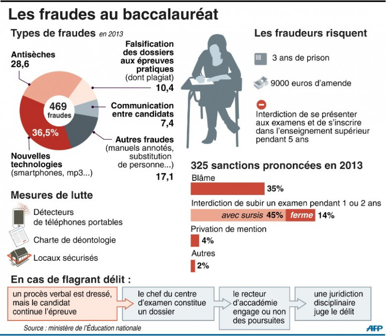 Peu importe la manière, la punition est la même. Un candidat qui triche risque jusqu'à 3 ans de prison, 9.000 euros d'amende et l'interdiction de s'inscrire aux examens et dans l'enseignement supérieur pendant 5 ans. Malgré les sanctions prévues, 325 cas de fraudes ont été comptabilisés l'année dernière.