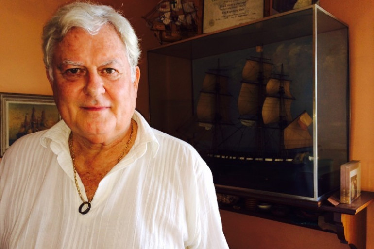 Érick Surcouf auprès de la maquette du "Confiance", le trois-mâts de son ancêtre Robert Surcouf avec lequel il arraisonna plusieurs navires anglais