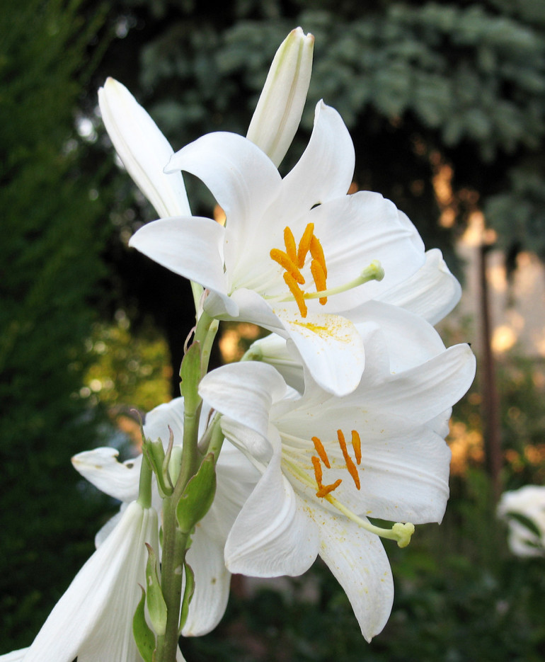 Le symbole de la pureté, avec en juin des grandes fleurs en trompettes, blanches et parfumées sur des tiges de près d’un mètre de haut. Les étamines sont couvertes de pollen d’or. Vous en avez tous déjà vu dans les vieux jardins, car c’est le symbole même des jardins de Curé. Cette fleur immaculée est devenue au Moyen-Age la fleur de la Vierge Marie. Symbole à la fois de pureté et de féminité. Donc, pas de jardin de Curé sans Lis de la Madone.