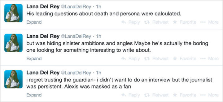 Le journaliste en question, contrairement à ce que Lana Del Rey affirme, ne s'appelle pas Alexis, mais Tim Jonze. Il n'a pas tardé à lui répondre dans un article. Selon lui, elle semblait heureuse de faire cet interview qui a duré 70 minutes.