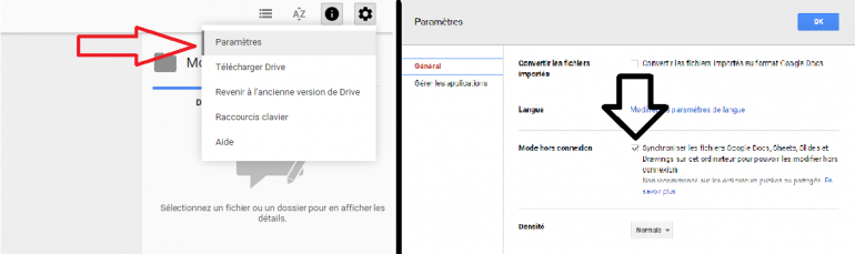 Travailler sur son espace Google Drive est toujours possible, même hors connexion. Pour cela, il suffit de se connecter une première fois, puis d'activer la fonction hors connexion. Les documents sont alors toujours accessibles, et il suffit de se reconnecter plus tard pour mettre à jour les fichiers présents en ligne.
