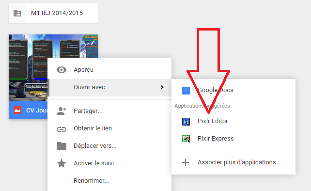 Deux extensions permettent de faire de la retouche de photo directement à partir de Google Drive : Pixlr Express et Pixlr Editor.. Une fois installées, il suffit alors de cliquer droit sur l'image à retoucher, et de choisir entre les deux sites. L'image est alors ouverte sur le site choisi et peut être retouchée grâce à plus de 250 effets.