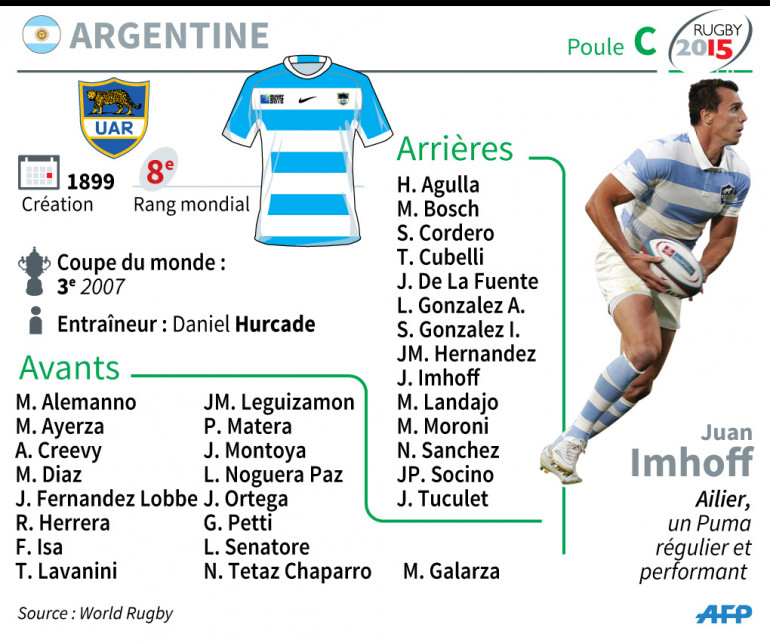 Le groupe argentin, qui s'est constitué autour de certains cadres expérimentés comme Juan Martin Hernandez, Augustin Creevy, Juan Fernandez Lobbe ou Marcelo Bosch (pensionnaires ou ex-pensionnaires du Top 14), l'équipe a largement été renouvelée ces derniers mois. Une donnée importante à quelques jours du début de la Coupe du monde. Les jeunes joueurs vont-ils s'intégrer et faire le poids ? La question est légitime. Mais la récente victoire face à l'Afrique du Sud laisse présager de certaines belles choses. À confirmer dès les premiers matches dans une poule C abordable où seule la Nouvelle-Zélande fait office d'épouvantail.