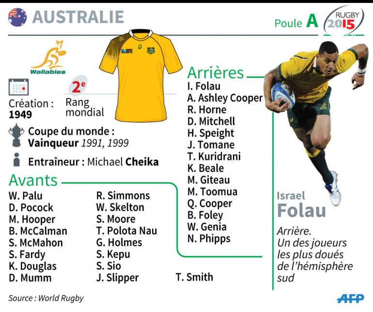 Double championne du monde (1991, 1999), l'Australie devrait figurer parmi les prétendants au sacre pour l'édition 2015 du Mondial en Angleterre (18 septembre-31 octobre). Mais après une période de résultats décevants et de troubles au sein de la direction, les Wallabies doivent retrouver de l'efficacité sous l'égide de Michael Cheika, appelé à la rescousse à l'automne 2014, pour vraiment faire partie du peloton des favoris.