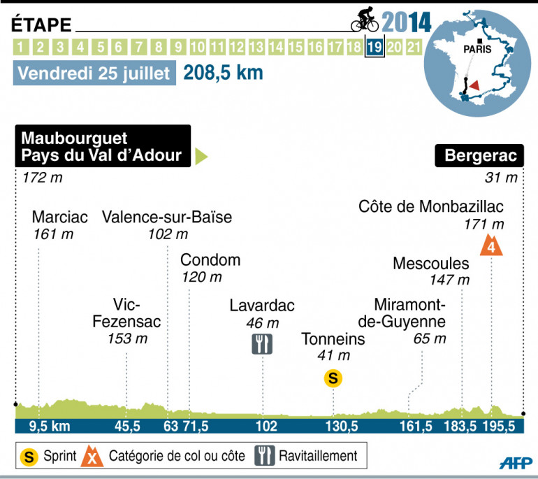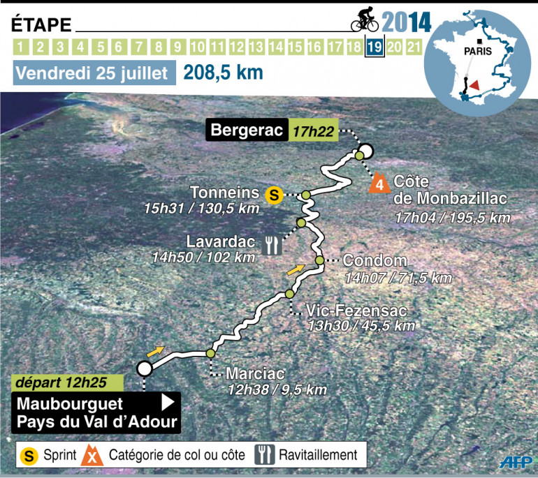 Une seule difficulté, la côte de Monbazillac, un nom célèbre dans l'univers des vins liquoreux, figure sur le livre de route. Mais cette petite montée de 1.300 mètres, à 7,6 % de pente moyenne, est située à seulement 13 kilomètres de l'arrivée.