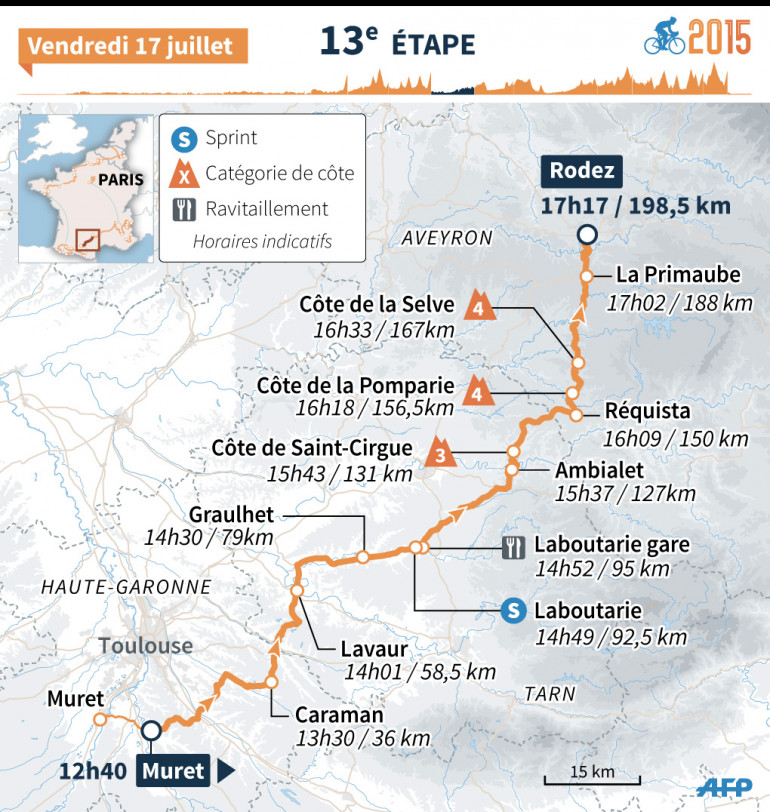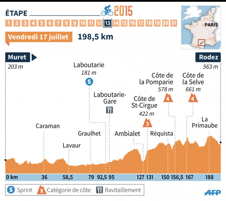 Vendredi 17 juillet, le Tour se rend à Rodez, sur un parcours vallonné de 198,5 kilomètres à travers la région Midi-Pyrénées. Trois côtes figurent sur le parcours dans la seconde moitié de cette 13e étape qui s'élance de Muret, au sud de Toulouse. La plus importante, cependant, n'est pas classée pour le Grand Prix de la montagne, qui récompense le meilleur grimpeur.