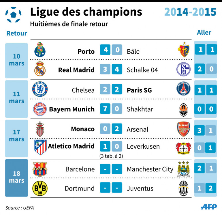22h37 - Monaco, le Paris Saint-Germain, le Real Madrid, l'Atletico Madrid, le FC Barcelone, le Bayern Munich, la Juventus Turin et le FC Porto seront donc au rendez-vous des quarts de finale de la Ligue des champions, dont le tirage au sort aura lieu vendredi 20 mars à 12h en Suisse.