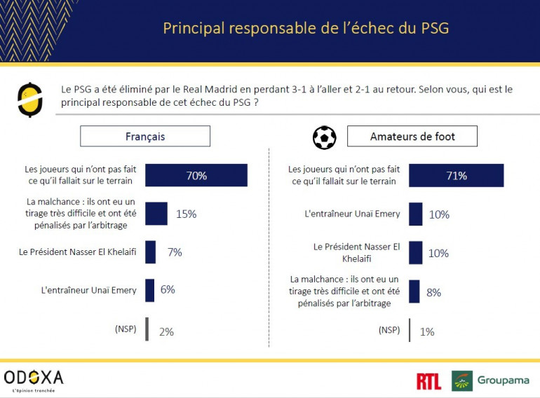 Les joueurs du PSG sont les principaux responsables de l'élimination contre le Real Madrid en 8e de finale de la Ligue des champions, bien plus que l'entraîneur, le président ou la malchance. Diego Simeone est le coach qu'il faut pour la saison prochaine. Paris doit en priorité recruter un défenseur gauche et un milieu défensif. Une majorité de Français pensent que Neymar partira l'été prochain.