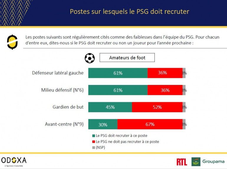 Au-delà de l’entraîneur, certains postes sont régulièrement pointés comme des points faibles du PSG. Pour chacun d’eux, nous avons interrogé les amateurs de football sur la nécessité ou non de recruter à ce poste. Selon eux, le PSG doit recruter en priorité un latéral gauche et un numéro 6 capable de jouer en sentinelle (61% d'avis favorables dans les deux cas).