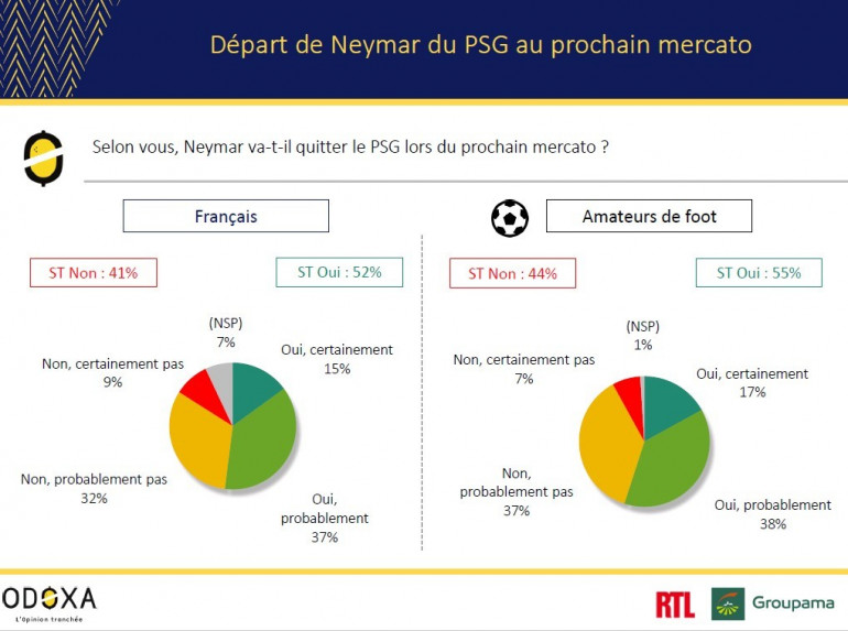 Reste le cas Neymar, forcément présent dans ce sondage. À la question "selon vous, le Brésilien va-t-il quitter le PSG lors du prochain mercato", une courte majorité de oui se dégage chez les Français (52%) comme chez les passionnés (55%). La star de 26 ans ne serait alors restée qu'une seule saison à Paris, saison probablement terminée dès le mois de mars...