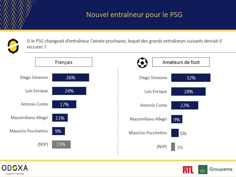 De nombreux noms circulent et certains ont été testés dans notre enquête. Si aucun ne fait l’unanimité, deux se dégagent dans l’esprit des Français et des amateurs de football. En tête, l'Argentin Diego Simeone (Atlético de Madrid) réunit 26% des Français et 32% des amateurs de football.