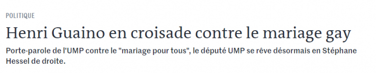 Ci-dessous, vous voyez un titre d'un article du Monde expliquant qu'Henri Guaino (député LR jusqu'en juin 2017) était un fervent opposant au mariage pour tous en 2013.