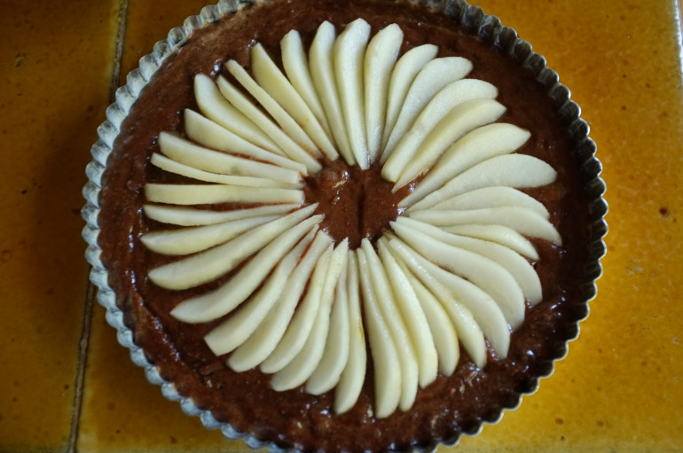 Peler et couper les poires en fines lamelles égales. Disposer les lamelles de poires en cercle sur la pâte sans gluten. Cuire 40mn, en n’oubliant pas de faire une rotation du moule à mi-cuisson.