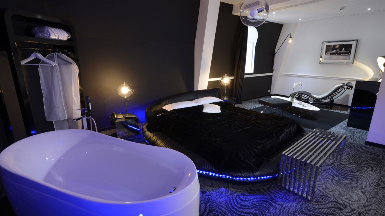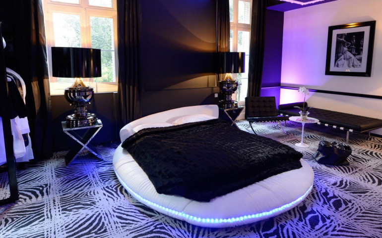 C’est un hôtel 4 étoiles, il y a des lits ronds, des lits à baldaquin, à propos des lits, une autre idée qui ne coûte pas chère : une guirlande de leds a été fixée autour du sommier. On a l’impression que le meuble flotte dans la pièce.