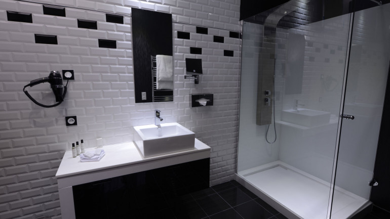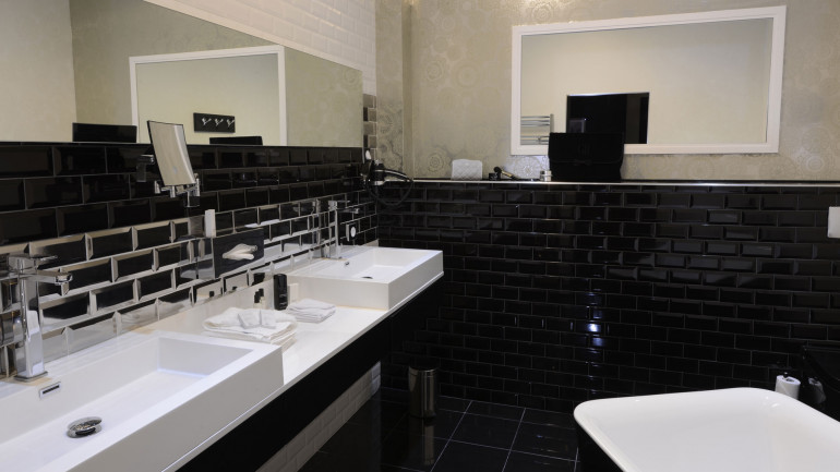 Des salles de bain en noir et blanc : un sol noir, associé à du carrelage blanc sur le mur. Et le détail qui change tout : quelques carreaux noir qui forment une frise. Dans une autre salle de bain, on voit sol noir et carreaux noirs sur le mur jusqu’à mi hauteur, puis ensuite tout devient blanc.