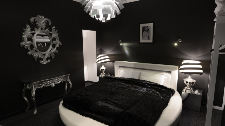 Les chambres sont toutes différentes : mais uniquement avec du noir et du blanc. Au sol : une moquette noire et blanche avec des motifs, ça peut être des motifs zébrés, des motifs géométriques… Puis ensuite, selon les chambres, il y a des subtilités dans l’utilisation de ces teintes. Si vous avez des envies de noir ou blanc, piochez des idées afin de les reproduire chez vous.