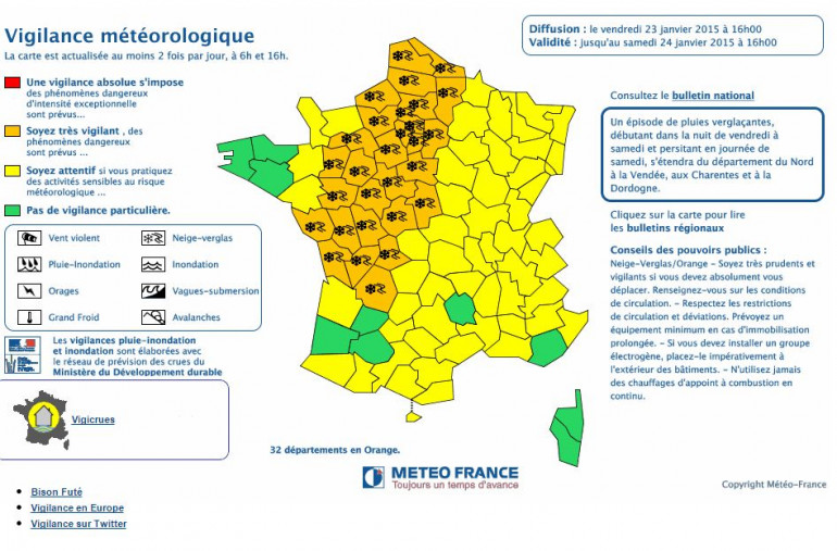 Météo France a placé 32 départements en vigilance neige et verglas pour vendredi soir