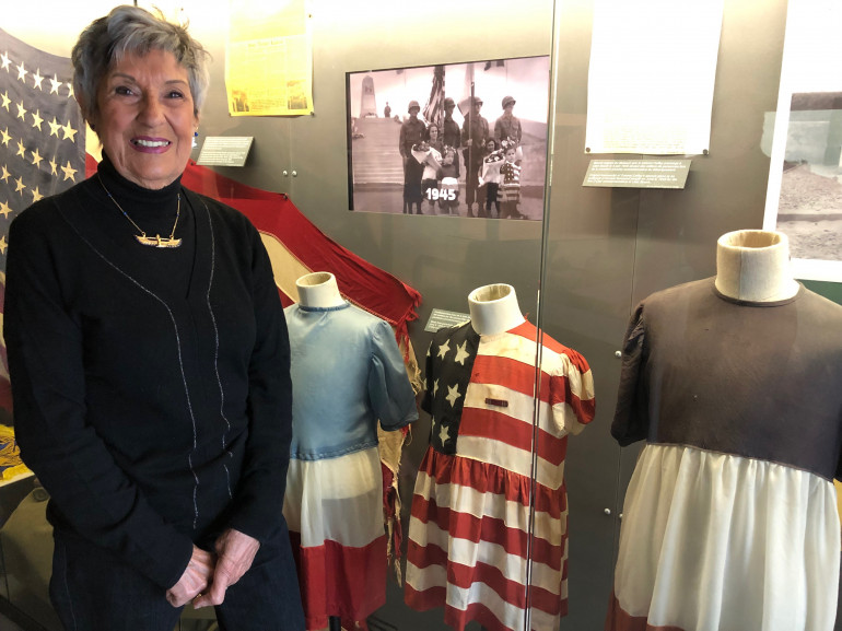 Danielle Patrix en avril 2019 pose devant la robe qu'elle a confie´ au Muse´e d'utah Beach, la robe qu'elle portait lors du 1er anniversaire du De´barquement en juin 1945
