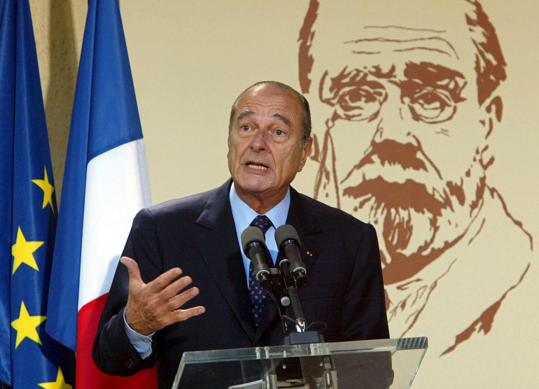 le président Jacques Chirac prononce une allocution devant la maison d'Emile Zola, le 06 octobre 2002 à Medan, à l'occasion du centenaire de la mort de l'écrivain.