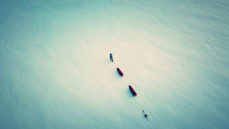 Me voilà seul avec mes deux traîneaux de 80 kg chacun. Quand la banquise est plate, les traîneaux glissent et je peux marcher jusqu'à 18 km par jour. Mais bien souvent la banquise est accidentée, avec des reliefs de plus de 80 cm, ce qui ralentit largement ma progression. La neige poudreuse colle aussi les traîneaux au sol, m'obligeant parfois à avancer avec un seul des traîneaux pour revenir chercher l'autre ensuite.
