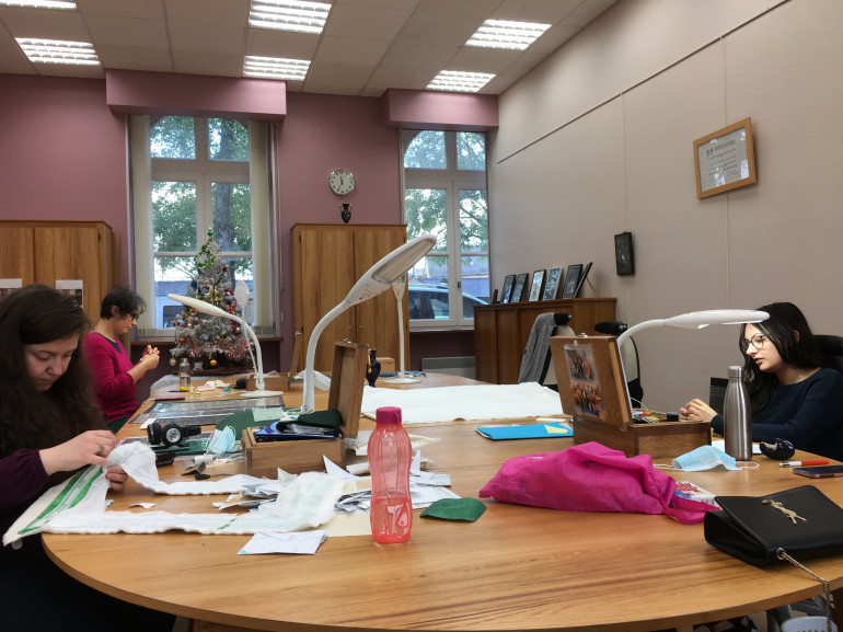 Et c’est dans cet atelier que nous avons pu pénétrer, une structure où travaillent encore 9 dentelières dans une ambiance quasi monacale, comme Valérie Durand cheffe d’atelier : "Nous commençons par les dessins. Le dessin artistique représente notre dentelle telle qu'elle sera au final. Le dessin technique va nous servir à piquer notre parchemin".