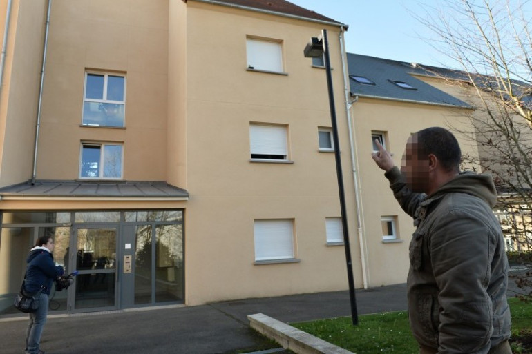 Un homme pointant l'appartement dans lequel a vécu Fabien Clain à Alençon