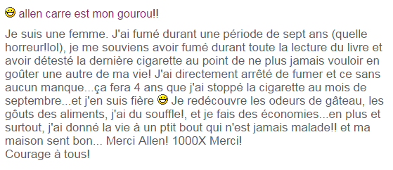 C'est en tout cas ce que les avis de certains lecteurs laissent penser, en laissant une multitude de commentaires élogieux à l'égard d'Allen Carr, auteur de La méthode simple pour en finir avec la cigarette (The Easy Way to Stop Smoking), best-seller traduit dans toutes les langues et vendu à plus de treize millions d'exemplaires dans le monde.