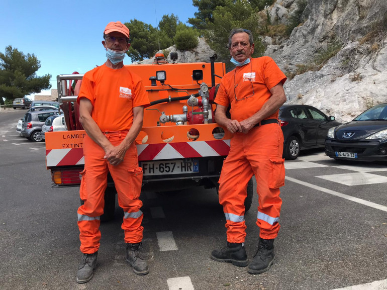 Jean-Charles et Bernard profitent de leurs retraites pour se balader dans les massifs en combinaisons orange, au volant d’un pick-up du même ton, équipé d’une lance à incendie. Leurs missions : éteindre les premières flammèches mais surtout guider les soldats du feu au milieu de cette jungle.