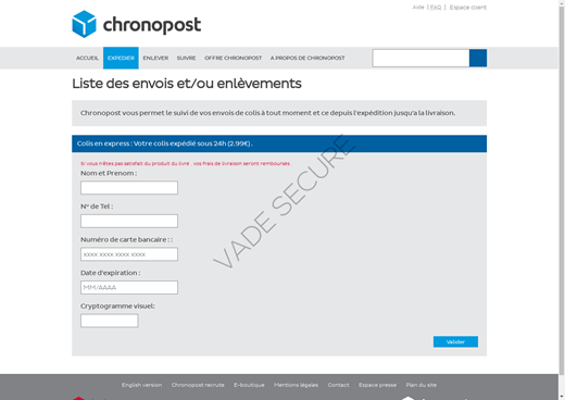 Une fois cliqué sur lie lien contenu dans le message, les victimes sont redirigées vers une fausse page de site Internet aux couleurs du service de livraison en question où ils sont invités à régler une somme d'argent par carte bleue.
