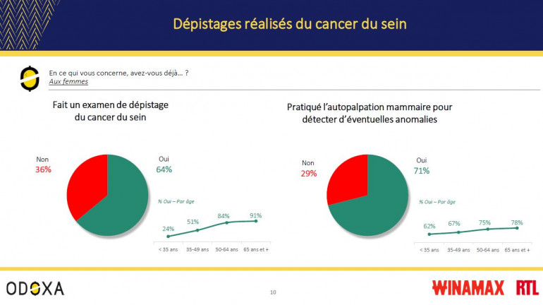 Et cette pratique semble également répandue dans la population : 71% des Françaises disent avoir déjà pratiqué l’autopalpation mammaire pour détecter d’éventuelles anomalies. L’adoption de ce comportement de prévention est majoritaire aussi bien chez les 65 ans et plus (78%) et les 50-64 ans (75%) que chez les 35-49 ans (67%) et les moins de 35 ans (62%).