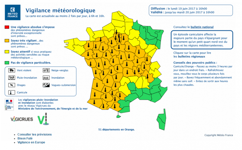 Le thermomètre s'affole depuis quelques jours en France, où le mercure atteint et dépasse largement même les 30 degrés dans l'hexagone. Si bien que Météo France a lancé une alerte orange canicule sur 51 départements ce lundi 19 juin. Plus de la moitié des département de la France métropolitaine sont donc concernés par cette alerte, avec des pointes flirtant avec les 40 degrés en ce début de semaine étouffante.