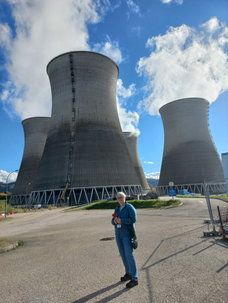 Notre reporter Sophie Joussellin, devant les tours réfrigérantes de la centrale du Bugey, en novembre 2022