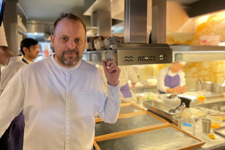 Au fond du bol, David Toutain, deux étoiles au Guide Michelin, dépose une cuillère à soupe de pommes vertes coupées en petits cubes. "Dessus, j'ajoute un siphon chaud de crème de sésame noir pour l'onctuosité", détaille le chef, concentré sur son dressage. Et enfin, quelques morceaux d'anguille fumée.