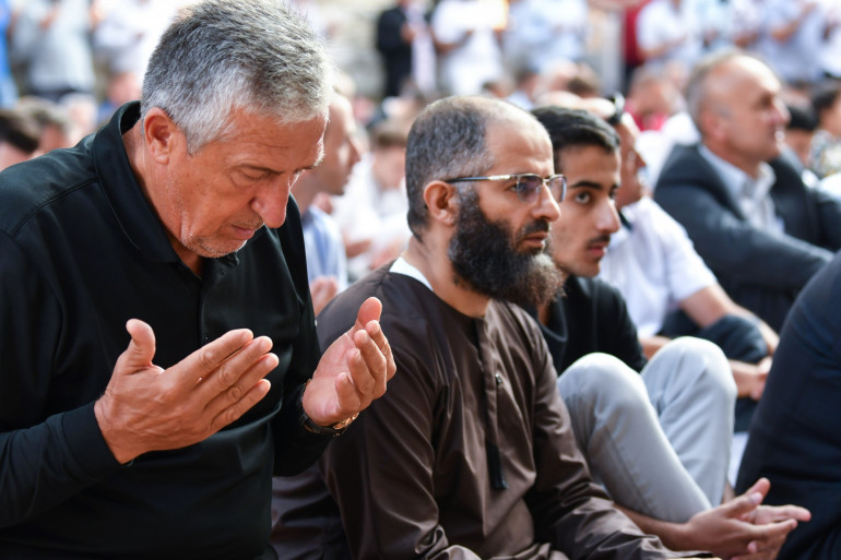 Des musulmans faisant une prière devant une mosquée (illustration)