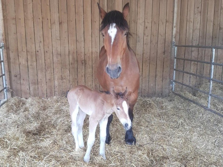 Dans leur haras de Gacé, dans l’Orne, Philippe et Roselyne Lucas ne cachent pas leur émotion. En deux jours, ce sont deux descendants de K12 qui viennent de naître. Le premier est un petit mâle de 64 kg né à 3h20 mercredi 24 avril, fils de Utine, 7 ans. Le deuxième est une femelle de 56 kg sortie vendredi 26 avril à 3h30 du ventre de Taloula, 8 ans. "Et quatre autres naissances sont attendues ces prochains semaines", annonce Philippe Lucas, qui préfère attendre un mois "par superstition" pour baptiser les nouveau-nés encore vulnérables.