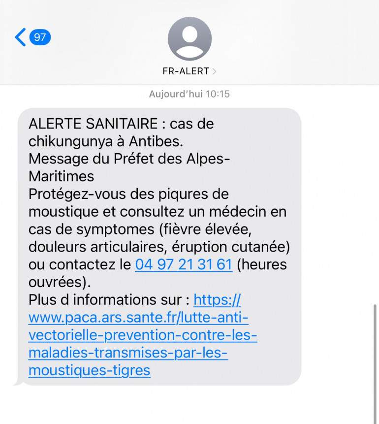 Dans le cadre de la lutte contre le chikungunya, la préfecture des Alpes-Maritimes a utilisé ce dispositif, mercredi 24 septembre. À 10 heures, les personnes présentes à Antibes ont reçu une alerte concernant les cas de chikungunya dans la ville.