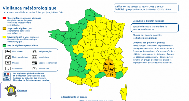 Météo France a place samedi en alerte orange aux vents violents pour dimanche cinq départements du sud de la France.