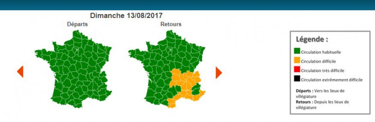 Les difficultés sont attendues dans le sens des retours, "plus particulièrement dans la région Auvergne-Rhône-Alpes" et "sur l'arc méditerranéen". La journée du 13 août sera en revanche classée vert au niveau national dans le sens des retours.
