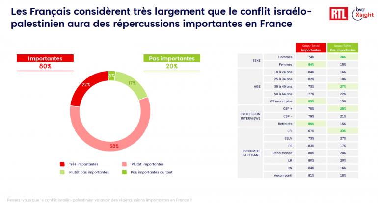 Quel est l'impact du conflit entre le Hamas et Israël sur les Français ? Selon l'enquête nationale BVA-Xsight pour RTL, réalisée entre le 18 et le 19 octobre, une grande part de la population serait inquiète des répercussions du conflit en France, et notamment de la résurgence d'attentats islamistes sur le territoire. Ainsi, 80% des Français sondés pensent que des répercussions importantes vont toucher le pays, soit 8 Français sur 10. Pour 22% d'entre eux, les conséquences seront très importantes.