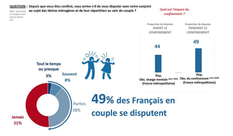 Un français sur deux (49%) a déclaré s'être déjà disputé avec son conjoint au sujet des tâches ménagères et de leur répartition au sein du couple depuis le confinement. Les jeunes de moins de 25 ans sont en particulier plus nombreux (39%) à trouver un terrain d'entente sur cette question.