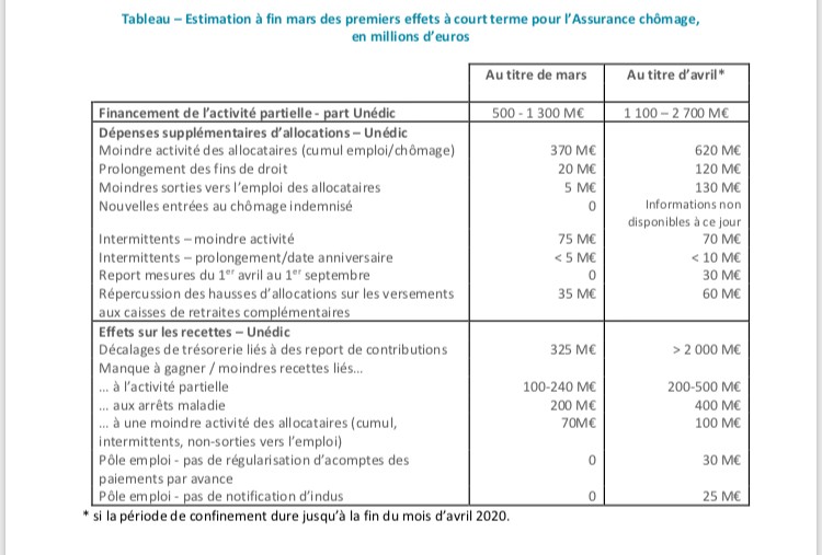 Et ce n’est pas tout. Pour l’Unédic, il y aura non seulement des dépenses supplémentaires, mais en plus, du fait de l’activité partielle, des recettes n’entreront pas dans les caisses pour le mois de mars (entre 100 et 240 millions d’euros de manque à gagner), comme pour le mois d’avril (entre 200 et 500 millions d’euros).