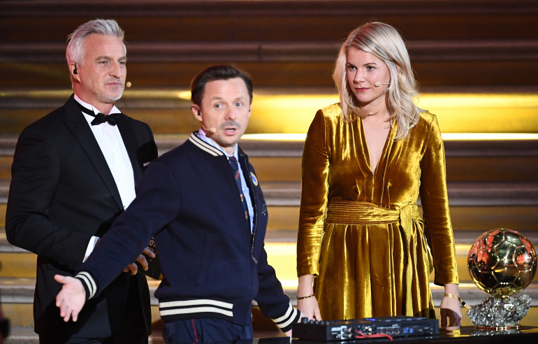 David Ginola, animateur de la soirée du Ballon d'or, en compagnie du DJ et co-hôte de la soirée Martin Solveig et de la lauréate Ada Hegerberg